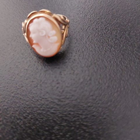 Kaunis hyväkuntoinen Camee-sormus. Sormuksessa hopea 925 leima, näkyy kuvassa. Ajan saatossa leima on kulunut, joten se on hieman epäselvä. Sormuksen koko noin 15. Aito camee.