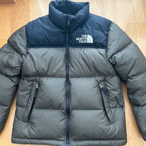 Myynnissä hyväkuntoinen The North Face retro nuptse untuvatakki. Väri musta-vihreä. Koko Junior XL. (Kuvassa käytössä noin 158cm pojalla paksumpi huppari takin alla)