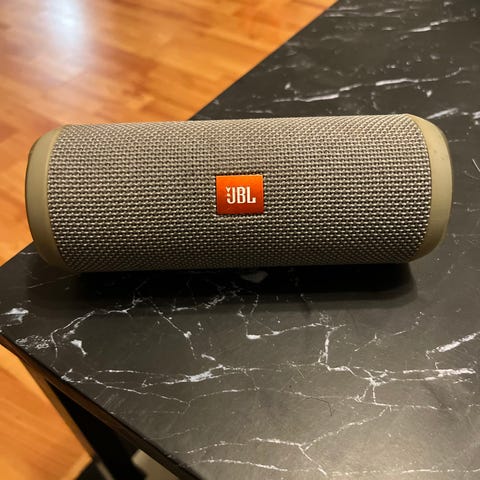 JBL kannettava Bluetooth-kaiutin musta. Langaton kaiutin, jossa musta verkkomateriaali ja kuminen yläosa, sisältäen virtapainikkeen, Bluetooth-yhteyden ja akun varaustilan merkkivalot.
