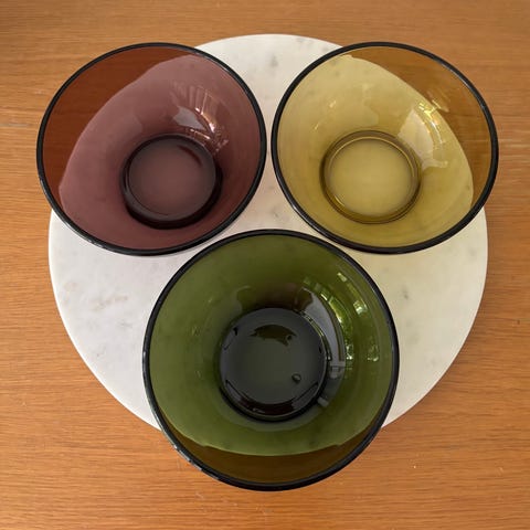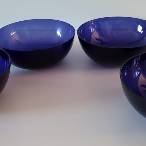 Nuutajärven tuotannossa 1950-1960 -luvulla oli Kaj Franckin suunnittelemia värillisiä lasimaljoja. Myynnissä kaksi turkoosin sinistä jälkiruokamaljaa. Halkaisija 12cm, korkeus 4cm, paino 80g ja 103g. Maljat ovat käsityönä tehtyinä yksilöitä ja painossa on siten eroja, toinen puhaltelee lasista ohuemman kulhon kuin toinen :)