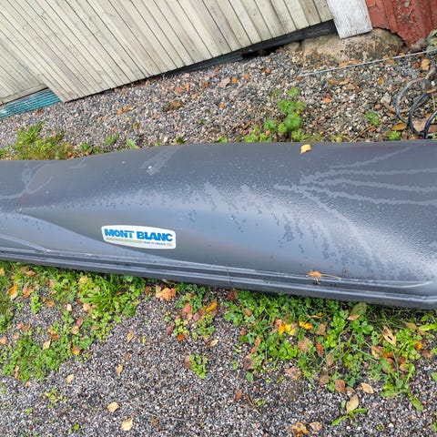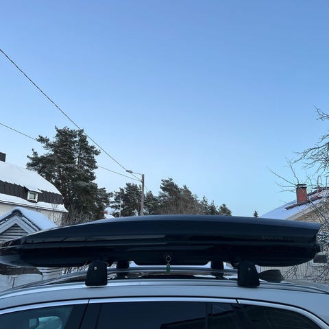 Volvon iso suksiboksi. Aukeaa kummaltakin puolelta. Täysin uutta vastaava. Boksi on noin 235cm pitkä ja 90cm leveä (ulkomitat). Boksi on lukittava. Suksiboksilla on tehty ainoastaan yksi Levin reissu ja ollut sen jälkeen tarpeettomana tallissa. Volvon tarrat saa tarpeen mukaan helposti pois (Thulen boksi).