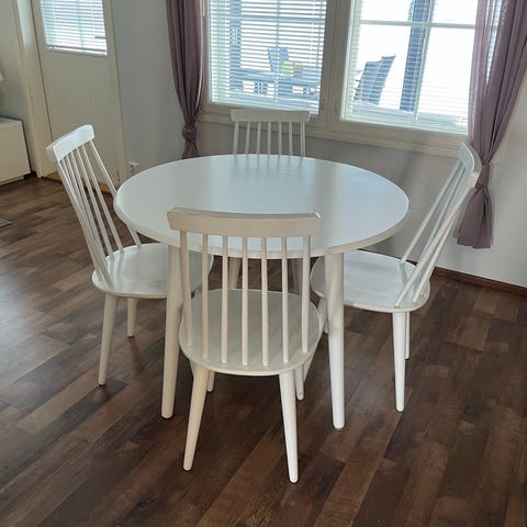 Pyöreä ruokapöytä ja kaksi todella laadukasta ravintola tuolia mukaan, aitoa puuta ja nahkaa