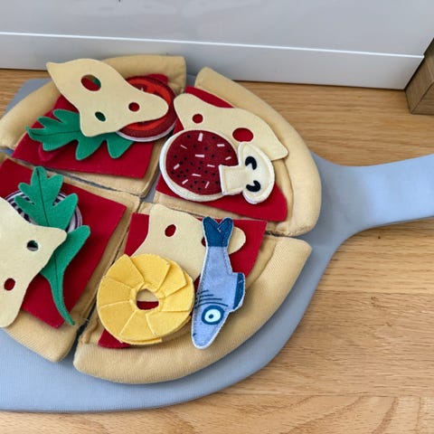 Lapsen keittiöleikkeihin pizza ja tarvikkeet. Savuton, eläimetön koti.