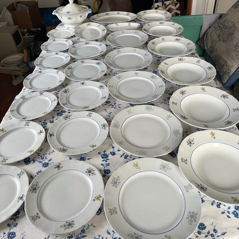 Kultaiset reunat, 2 keittolautasta, 3 pientä alkuruoka/salaattilautasta, 3 ruokalautasta