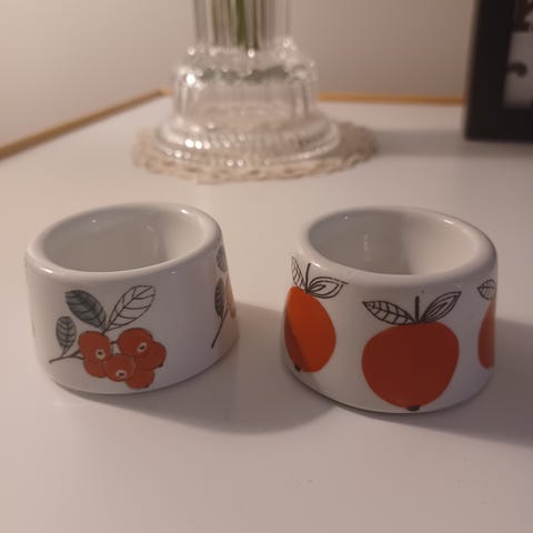2 kpl Arabian omena munakuppeja, jotka suunnitellut Esteri Tomula. Tuotannossa 1959- 1975. Vintagea. Korkeus 3,3 cm ja halkaisija 5,5 cm. Hyvä paketointi.