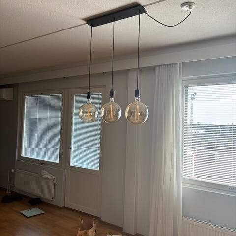 Led riippuvalaisin himmennys toiminnolla, jossa on neljä osaa ripustettuna vaakasuoraan tankoon. Valaisin on valmistettu metallista ja muovista, ja sen väri on pääosin hopeanharmaa. Valaisin soveltuu sisäkäyttöön ja tarjoaa valoa esimerkiksi ruokailutilaan tai oleskelutilaan.