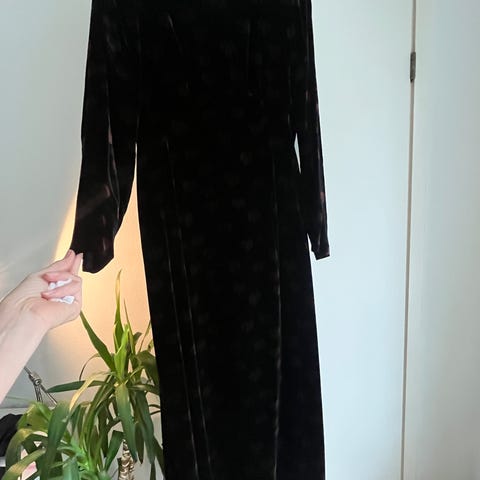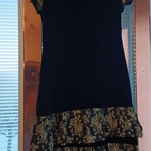Todella upea ja ainutlaatuinen vanha iltapuku. Erittäin vaikea saada onnistumaan kuvissa, mutta istuu päällä kauniisti ja kangas laskeutuu upeasti. Materiaalina kiiltävä musta sametti (mahdollisesti silkkisametti). Helma levenee alaspäin ja on takaa noin 20cm pidempi kuin edestä. Näyttävin yksityiskohta on vasemmalta olalta lähtevä lähes maahan asti yltävä liehuke, joka on toiselta puolelta valkoinen, toiselta musta. Kyljessä on vetoketju. Huom! Puku on vanha, ja siinä on pieniä käytön jälkiä, helmassa jonkun paikkaama pieni viilto, joka ei kuitenkaan näy käytössä.