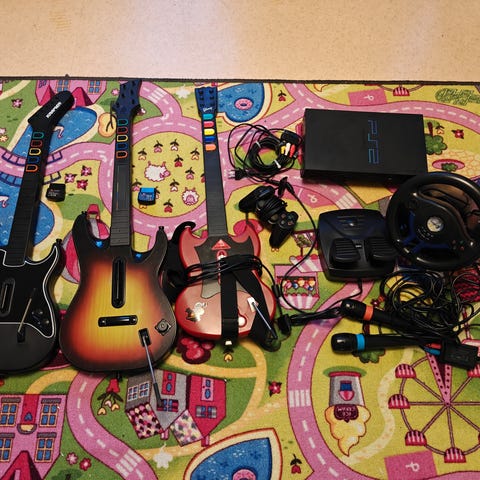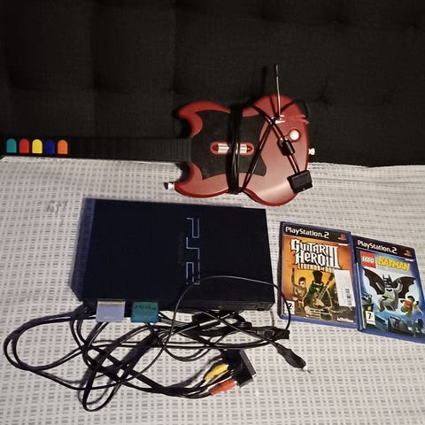 Sony Playstation 2 pelikonsole sisältäen ohjaimen ja liitäntäkaapelit. Mukana Guitar Hero III Legends of Rock ja Guitar Hero II pelit.