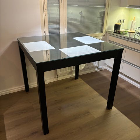 Koko setti siistikuntoinen, mutta pöydän kannessa pieni kauneusvirhe (kuva). Ei häiritse silmää ja saa peitettyä pöytätabletilla.
