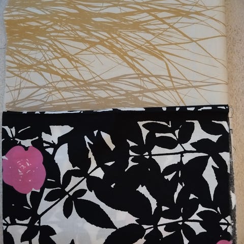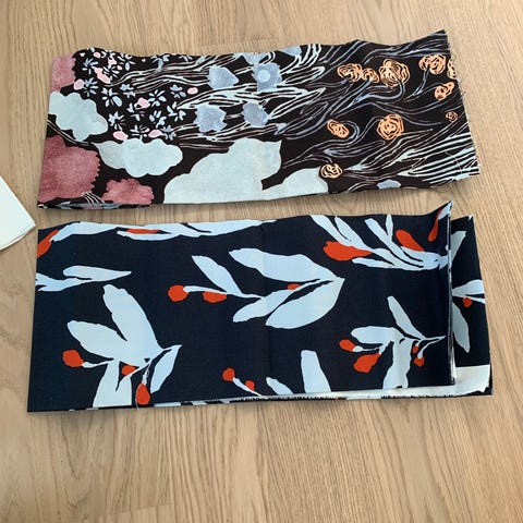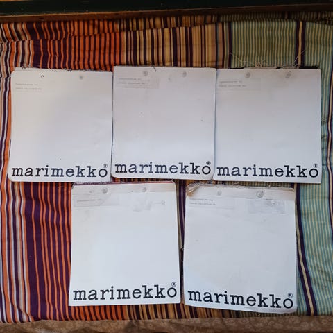 Viisi erikokoista Marimekon kangaspalaa, neljä eri kuosia