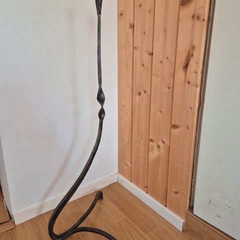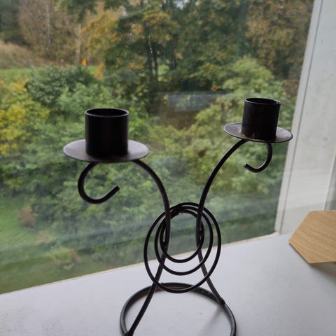 Metallinen kynttilänjalka, jossa valkoinen väri ja puuhelmiä. Sopii useamman kynttilän asetteluun.