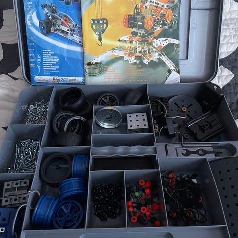 Meccano rakennussarja. Sarjaan kuuluu paljon erilaisia osia, ruuveja, metallilaattoa yms. sekä patterikäyttöinen ruuvain, jolla osat saa kiinnitettyä. Osat muovirasiassa, jonka saa halutessaan mukaan.
