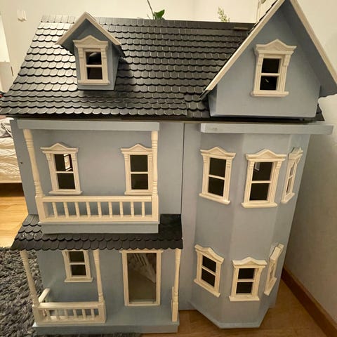 Hyväkuntoinen, iso nukketalo. Katossa reunoissa vähän kulumaa. Ovea ei ole, aukko löytyy. Etuseinä aukeaa sekä toinen puoli kattoa.