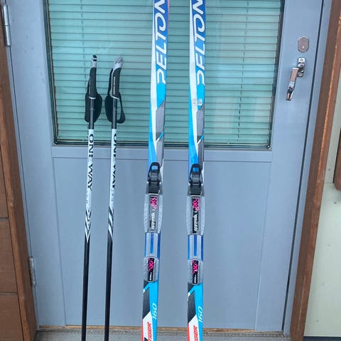 Sukset noin 87 cm ja sauvat noin 83 cm.