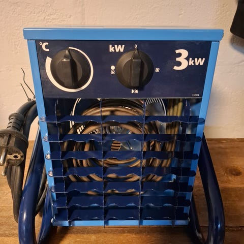 Sawo 5 kW sähköpuhallinlämmityslaite, väriltään punainen. Laite on tarkoitettu tilojen lämmitykseen ja siinä on puhallinlämmitystoiminto. Voimavirta. Nouto Raisiosta P.045-2344213