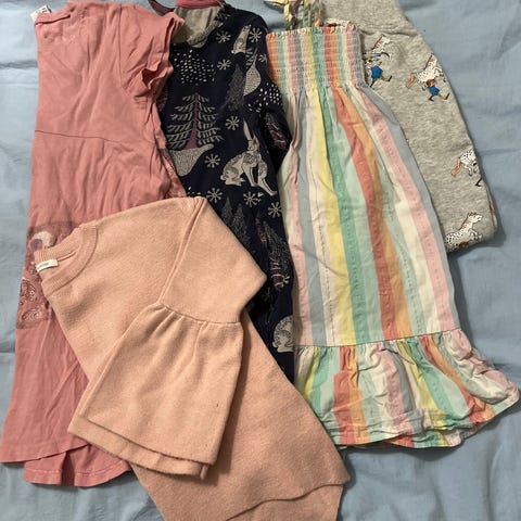 Siistiä hyväkuntoisia vaatteita, ei isompia tahroja, ihan joku voi jossain olla mikä ei lähde pesussa. Keltaisesta yksisarvismekosta paikattu reikä hihasta ja siinä alkava reikä helman ja mekko-osan taitekohdassa. Mielestäni kuitenkin siisti.