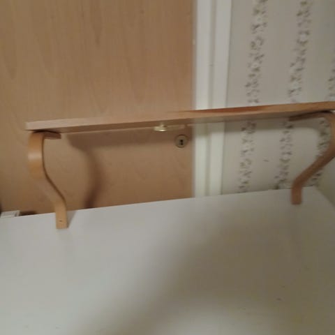 Seinään nojaava seinähylly. Kunto kohtalainen, tummentumaa ja maali hieman joistakin kohdin irronnut. Näkyvät kuvissa.