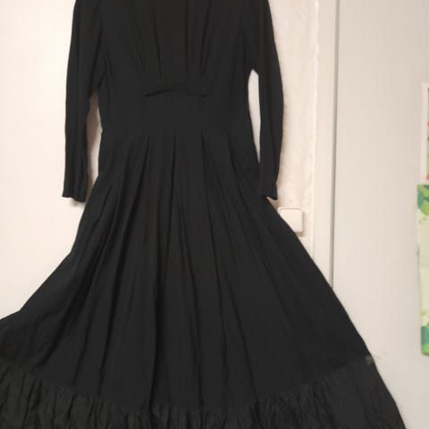 Musta vintage mekko, koko 40 (ehkä lähempänä kokoa 38). Mekossa on pitkä helma ja pitkät hihat. Kyljessä ja niskassa toimivat vetoketjut. Materiaali ja merkki eivät ole tiedossa. Mekko oli vanhojentansseissa 1980-l (silloin, kun vanhojen tanssit eivät olleet muuttuneet kaupallisiksi, vaan oltiin persoonallisia ja luovia). Mekko sopisi hyvin vanhojen autojen tapahtumaan, teematapahtumaan, teatteripuvustukseen ja rohkealle, tyyliä kaipaavalle ( kiinakamaan kyllästyneille)vanhojen tansseihin tms. Pitsikaulus tai jotain "pirteää" kaulaosaan tai vyötärölle tekee terää.