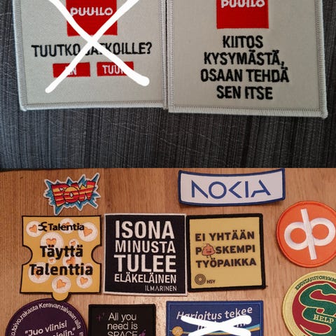Myydään kuvan kolme haalarimerkkiä. Yhteishinta 10€.
