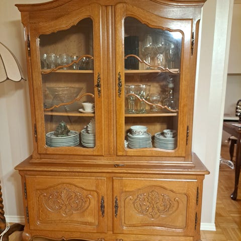 Annetaan tumman ruskea vitriini. Alakaappien syvyys 40cm, yläkaappien 35cm. Ihan ok kunto, vähän kulumaa jossain reunoissa mutta saranat toimii täysin. Vitriini tällä hetkellä kahdessa osassa. Nouto Hamulasta.