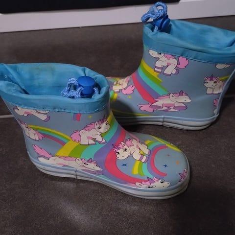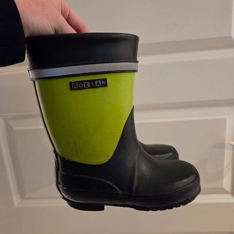 Myydään seuraavalle pienelle vuorelliset kumpparit. Hyväkuntoiset, heijastimet näyttää ihan hivenen repsotella. Nimikoidut. Varren saa kiristettyä. Toimii niinkuin saappaiden pitääkin,eli pitävät vettä 😃