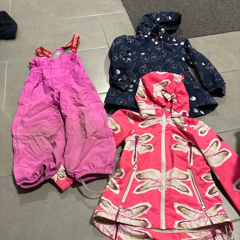 Tyttöjen ulkovaatepaketti 98/104. Eniten 104 kokoa vastaava. Talvivaatteita, välikausivaatteita ja Viking talvikengät koko 25 (pohjallinen 16,5cm), lenkkarit 24/25 (pohjallinen 16cm). ReimaTec, Didriksons, Petite Cherie, Viking, Lindex Fix. Toppahaalari, toppahousut, välikausihousut, fleecevuorellinen kurahaalari.