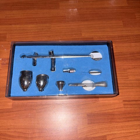 Uusi käyttämätön kynäruiskupakkaus sisältää kynäruiskun, mustan alumiinisen kantolaukun ja tarvittavat liitännät. Pakkaus sisältää myös virtalähteen ja letkun. Soveltuu tarkkaan maalaustyöhön ja pieniin yksityiskohtiin.