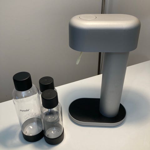 Noin vuoden vanha laite, kaksi pulloa joissa päiväys 06/27 sekä kaasupullo.