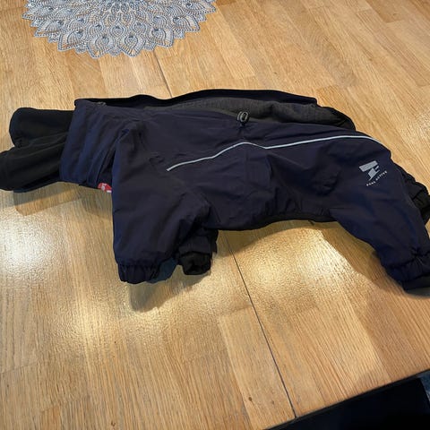 Mustista ja mirristä ostettu koiran toppahaalari koko 35. Omalle koiralle ei kelvannut. Ollut kerran käytössä, minkä jälkeen pesty. Ollut käytössä uroskoiralla, joten haaraosa poistettu ohjeistuksen mukaisesti.