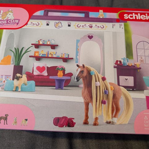 Myydään kuvissa oleva uusi ja avaamaton Schleich Horse Club Sofia's Beauties salonki. Pakkauksessa on 66 osaa sisältäen ihmishahmon, 2 koiraa, kissan ja hevosen. Salonki on kokoontaittuva ja siinä on kätevä kantokahva.
