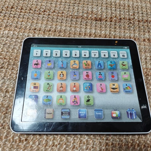 Myydään tarpeettomana lasten leikkitabletti. Tabletissa erilaisia pelejä. Miinuksena paristokannen puuttuminen, mutta teippiviritelmä toimii oikein hyvin.