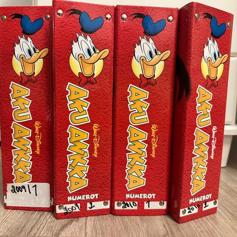 Aku Ankka -lehden vuosikerrat siististi kansiossa. En ole tarkistanut onko jokainen numero jokaisessa kansiossa, mutta toki voin tarkistaa, jos se tuntuu tärkeältä. Vuodet 2001-2004. 2002/1 lehdet on laitettu kansioon ns. väärin päin