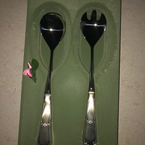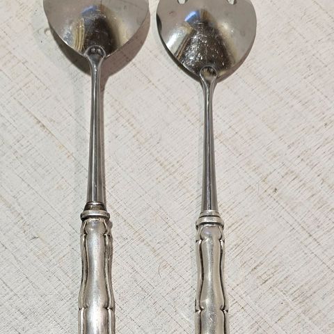 Chippendale Hopeiset salaattiottimet, joissa on koristeelliset kahvat. Sopivat salaattien tarjoiluun. Materiaali hopea. Käyttämättömät vaatii kiillotuksen.
