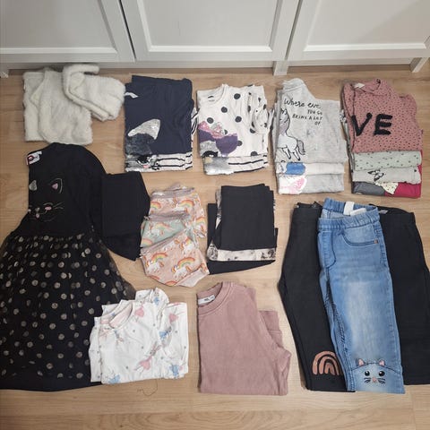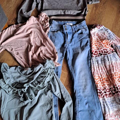 Paitoja ja housuja yht. 7 kpl + kaupan päälle yhdet housut, joissa polvessa pieni paikkaus (viimeisen kuvan housut, jotka ei näy kokoomakuvassa).