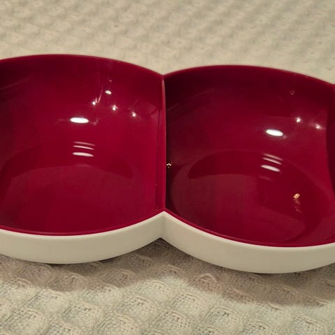 Hyväkuntoinen Tupperin tarjoiluastia. Punaisessa osassa ottimista pientä jälkeä, mutta yleisilme silti siisti. Käytetty ehkä kaksi kertaa.