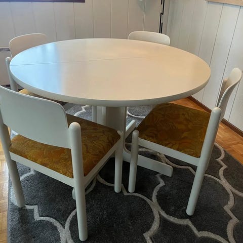 Tämä kokonaisuus on ajaton ja tyylikäs, sopii erinomaisesti keittiöön tai ruokailutilaan. Kaikki osat ovat hyväkuntoisia ja siistejä.