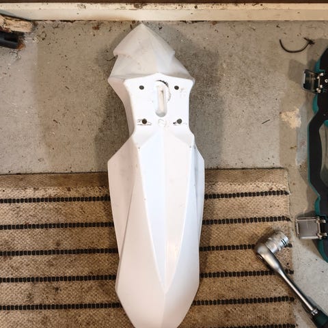 Derbiin valkoiset katteet missä on punaisia yksityiskohtia ja punainen fatbar tanko on hyvässä kunnossa pieniä naarmuja tangon kiinnikkeistä. numeromaski on maalattu mustaksi
