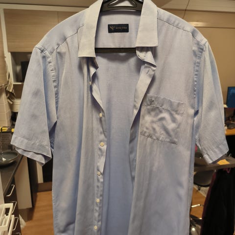 Sininen lyhythihainen kuviollinen kauluspaita. Ei kovin muodollinen, näyttää tyylikkäältä. Paita on erittäin kevyt ja hengittää hyvin. Lähes käyttämätön, laatu on erittäin hyvä. Koko: L, merkki: White Stone (ensiluokkainen turkkilainen vaatemerkki, valmistettu Turkissa)