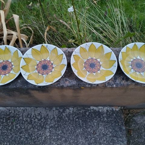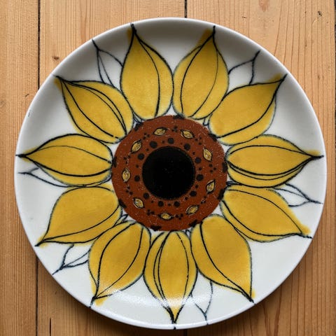 Vintage Arabia Aurinkoruusu lautanen, käsinmaalattu auringonkukkakoriste. Signeeraus HLA, Hilkka-Liisa Ahola. Arabia 1960-1975.