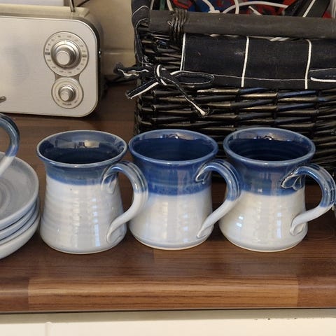 kustavin savi, mustikka mukit4 kpl +lautaset 4kpl ja yksi pikku kulho