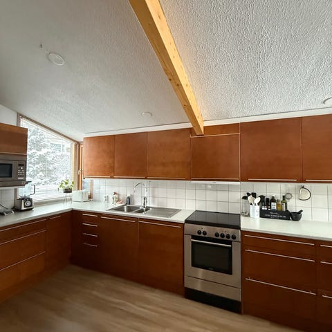 Keittiökalusteet ja kodinkoneet, sisältäen valkoiset kaapit, jääkaappipakastimen (Siemens), ja sähkölieden. Allashana Oras.