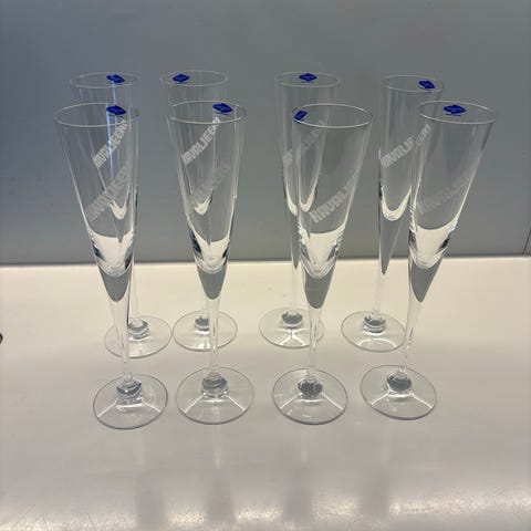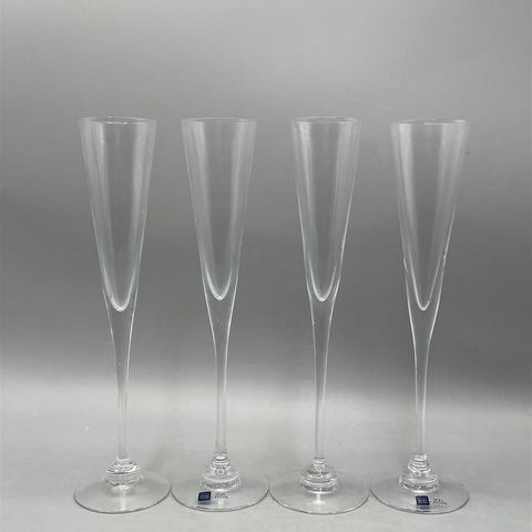 Nuutajärvi Aurora samppanjalasit 4kpl, jotka on valmistettu kristallilasista. Lasit ovat korkeita ja kapeita, sopien erityisesti samppanjan tarjoiluun. Design Heikki Orvola