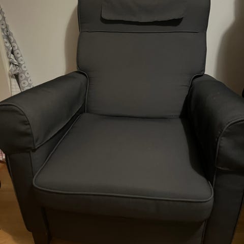 Ikea Muren mekanismilla toimiva recliner nojatuoli, jossa selkänoja taittuu taakse makuuasentoon nostaen samalla jalkatuen ylös. Verhoilussa vähäistä jälkeä, siisti.