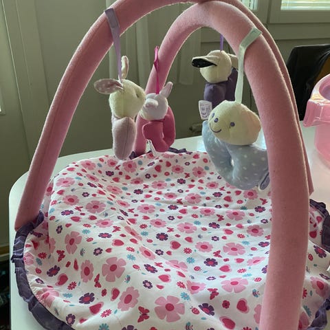 Baby Gym vauvan leikkikehys, jossa on värikkäitä leluja. Kehyksessä on siniset jalat ja oranssinväriset kulmat. Lelut sisältävät muun muassa pehmeän avokadohahmon, peilin, helistimiä ja muita erilaisia aktiviteetteja. Sopii vauvoille leikki- ja motoristen taitojen harjoitteluun.