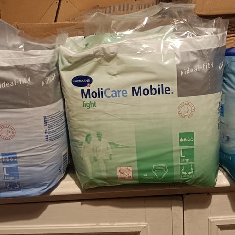 Hartmann MoliCare Premium Mobile L -kokoiset housuvaipat. Laatikossa 4 pakettia joissa 14 housuvaippaa jokaisessa. Myydään koko laatikko.