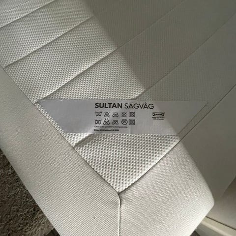 IKEA Sultan Sjöstad sänky, jossa on vaaleanharmaa päällinen. Patjassa näkyy käytön jälkiä ja tahrakohtia. 120cm leveä. Sänky narisee vähän.