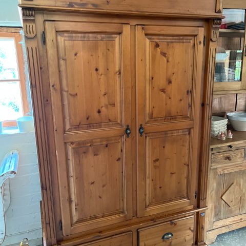 Alkuperäiskuntoinen. Osa laatikoista tallella. Vanha lukko ja saranat. Tummanpunainen/musta patina.
