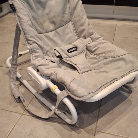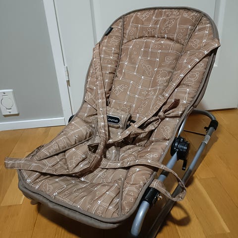 Emma Rocker Deluxe sitteri lelukaarella. Uuden hinta noin 50€. Mukaan kolme kuvan lelua ja muovinen kuljetuspussi.