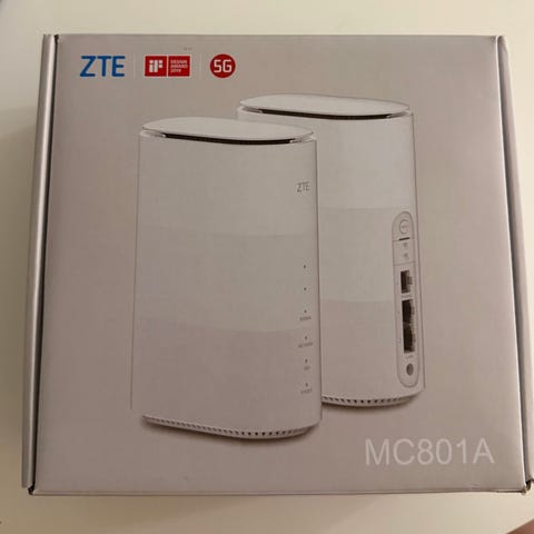 ZTE MC801A reititin tukee 5G-verkkoa. Sisältää tarvittavat liitännät sekä virtalähteen. Sopii langattomaan verkon jakamiseen 5G-yhteyden kautta.