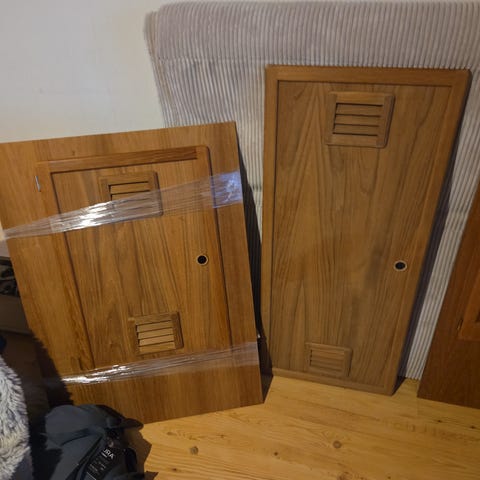 Tiikiovia ja tiikkiovia kiinni tiikkiviilutetussa levyssä eri kokoja